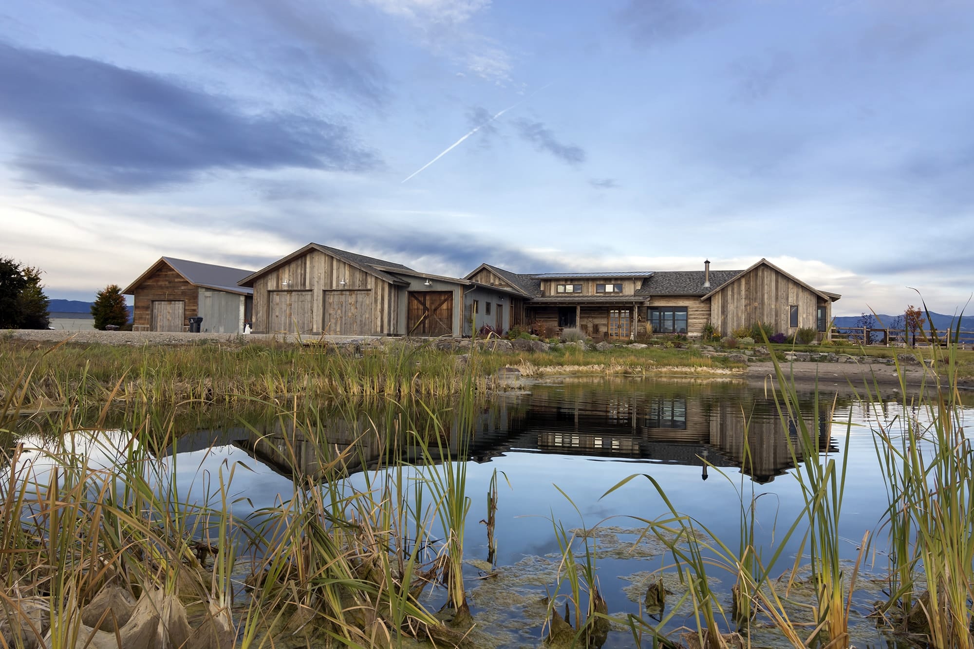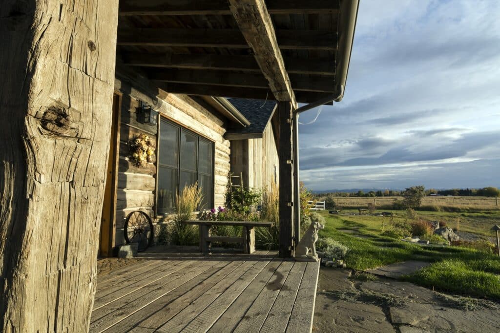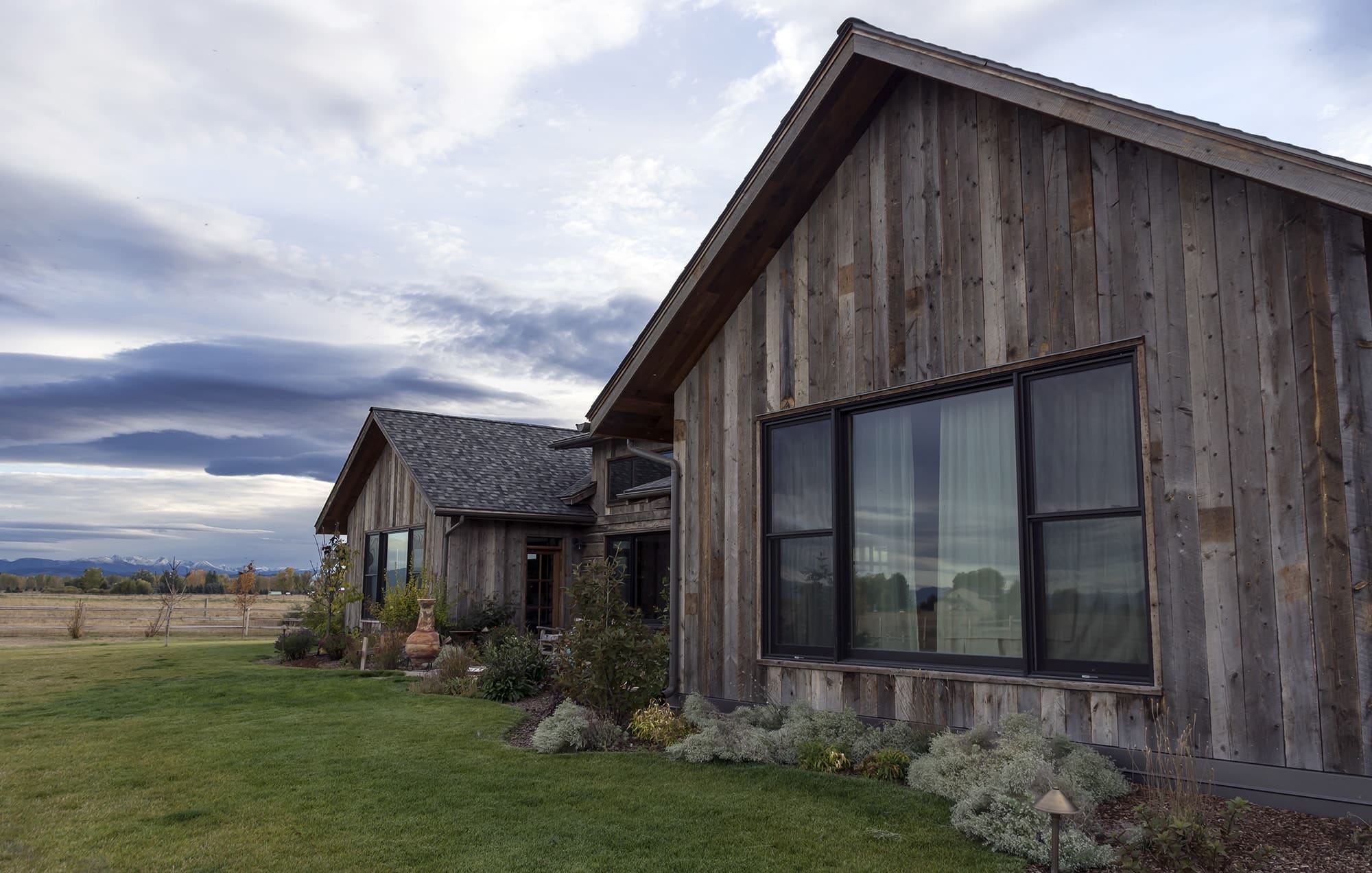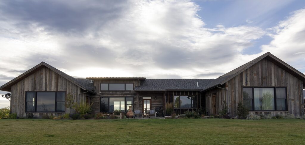 The Dry Creek home features a stunning mix of reclaimed wood siding and timbers that blend seamlessly into the surrounding landscape. The natural texture and weathered tones of the wood add rustic elegance to the exterior, while expansive windows and thoughtful craftsmanship create a warm, welcoming aesthetic. Old World Lumber’s materials give the home a timeless character rooted in Montana’s rugged charm.
